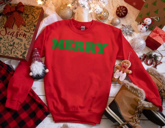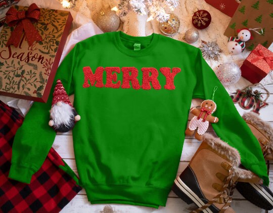 Merry Crew Neck Sweatshirt With Chenille Letters in Red or Green