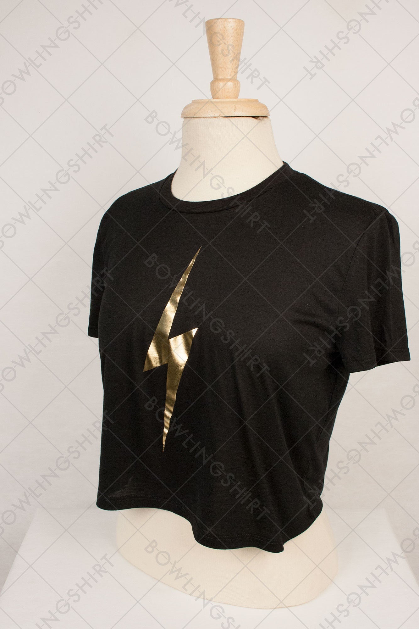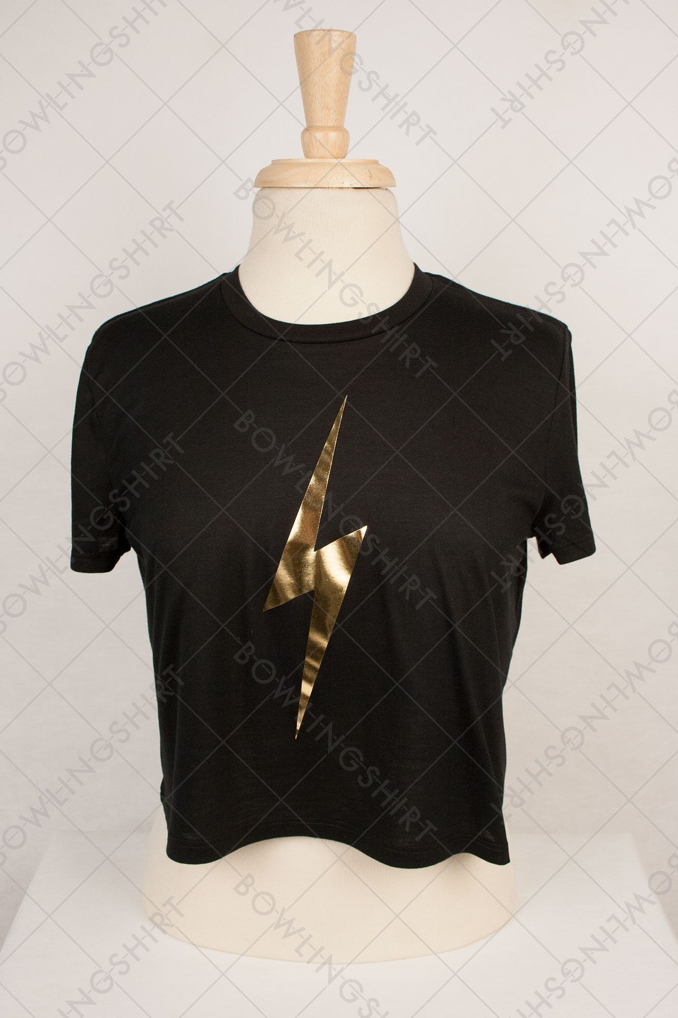 Crop tops are back and this one is soft and adorable. Metallic Lightning Bolt printed right on the front. Made to wash and dry
