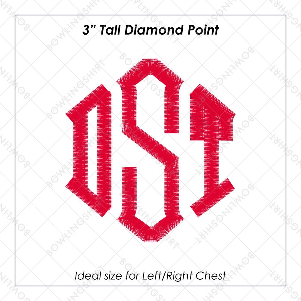 Monogram will be done on left chest. Diamond font will be 3 inches tall and Fancy font will be 3.5 inches tall.